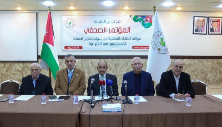 وفي مؤتمر صحفي، أكد رئيس مجلس النقباء ونقيب المهندسين الزراعيين المهندس علي أبونقطة، بحضور نقيب المهندسين المهندس أحمد سمارة الزعبي، ونقيب المحامين يحيى أبوعبود، ونقيب الأطباء الدكتور زياد الزعبي، ونقيب الممرضين خالد ربابعة، على الوقوف خلف القيادة الهاشمية، وتأييد الموقف الأردني الثابت والرافض لما وصفه بـ”الخطة المجنونة” التي يسعى الرئيس الأمريكي لتنفيذها بتهجير أهالي غزة إلى الأردن ومصر.