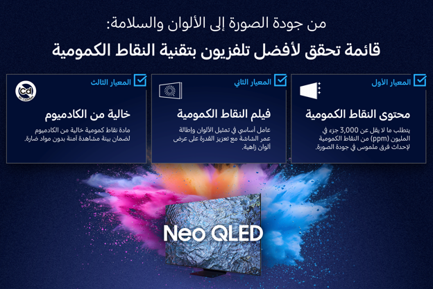 وبدأت سامسونج أبحاثها في تقنية النقاط الكمومية عام 2001، وساهم التزامها المستمر بالبحث والاستثمار في ترسيخ مكانتها في طليعة الابتكار في سوق الشاشات العالمي. وبعد تطوير أول مادة نقاط كمومية خالية من الكادميوم في العالم عام 2014، أطلقت سامسونج تلفزيونات مزودة بهذه التقنية في العام التالي. ومنذ ذلك الحين، تواصل الشركة ريادتها في تقنية النقاط الكمومية من خلال التطوير المستمر والابتكار التقني.