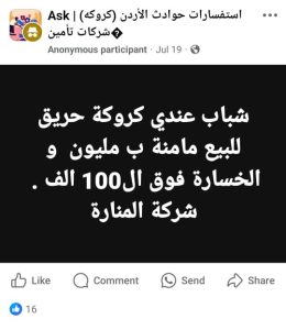 منشور على إحدى الجروبات عبر موقع فيسبوك والذي يختص بالاستفسارات حول “الكروكات” والتأمين والعديد من الأمور التي تقع في قطاع التأمين، ويقوم بطرحها المواطنين بهدف الحصول على وسيلة لفهم آلية التعامل مع الشركات، حيث يتعلق بشركة المنارة الإسلامية للتأمين، ما دفع العديد من حملة الوثائق الوقوف أمامه.