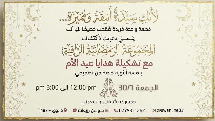 ويقدم البازار تشكيلة رمضانية فريدة وقطعاً مصممة بعناية لتناسب الأذواق الراقية، إلى جانب هدايا مميزة لعيد الأم، حيث تتميز كل قطعة بأنها فريدة ومصممة بلمسة خاصة من توقيع المصممة سوسن زريقات.