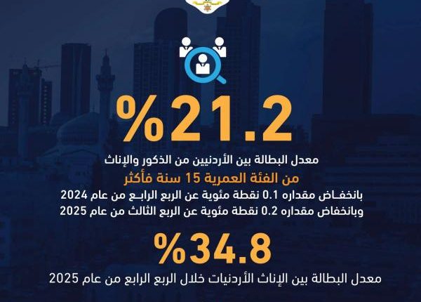 عمان الان – بلغ معدل البطالة بين الذكور الأردنيين 17.2% خلال الربع الرابع من عام 2025، بانخفاض مقداره 1.0 نقطة مئوية مقارنة بالربع الرابع من عام 2024، وبانخفاض مقدار 0.8 نقطة مئوية عن الربع الذي سبقه.
