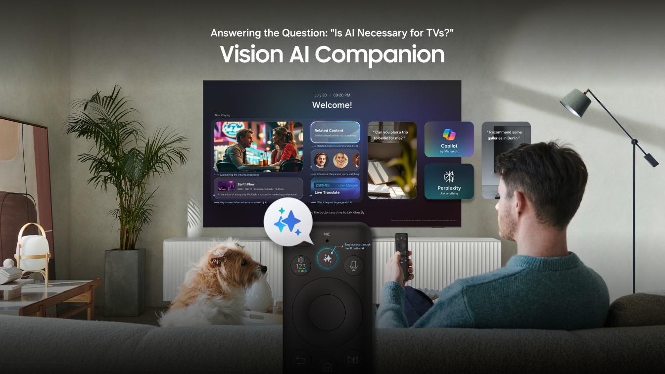 منصة Vision AI Companion: يمثل هذا الابتكار تجربة تلفزيونية استثنائية تعيد صياغة طرق تفاعل المستخدمين مع المحتوى؛ فمن خلال زر مدعوم بالذكاء الاصطناعي التوليدي، يمكن للمستخدمين التفاعل مع المحتوى بأساليب مبتكرة، مثل الاستفسار عن مسار الأحداث أو الشخصيات، أو البحث عن المعلومات ذات الصلة، أو التحكم في التشغيل عبر الأوامر الصوتية. ومن خلال الاستغناء عن القوائم المعقدة وأجهزة التحكم عن بُعد، يتيح هذا المساعد الذكي للمستخدمين الاستمتاع بتجربة مشاهدة تلفزيونية سلسة وأكثر تفاعلية.